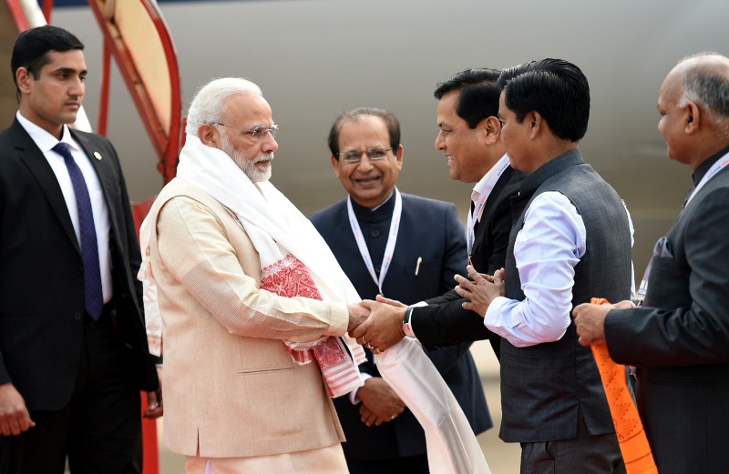 The Prime Minister, Narendra Modi being welcomed by the Governor of Assam, Jagdish Mukhi and the Chief Minister of Assam, Sarbananda Sonowal, on his arrival, at Guwahati, in Assam on February 03, 2018.