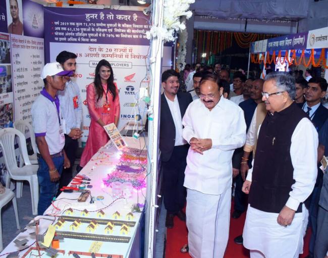 The Vice President, M. Venkaiah Naidu visiting the Stalls set up at the State Formation Day Celebrations of Chhattisgarh, in Raipur, Chhattisgarh on November 01, 2017. The Chief Minister of Chhattisgarh, Dr. Raman Singh is also seen.