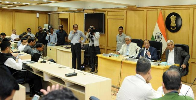 The Chief Election Commissioner, Achal Kumar Joti along with the Election Commissioners, O.P. Rawat and Sunil Arora addressing the press conference to announce Election Schedule to Legislative Assembly of Gujarat, in New Delhi on October 25, 2017.