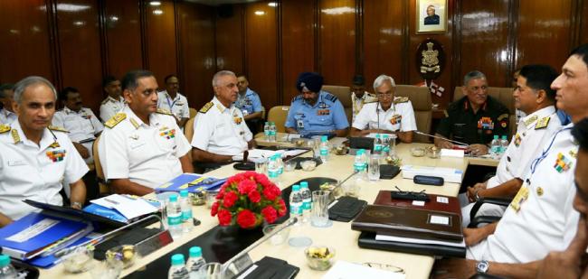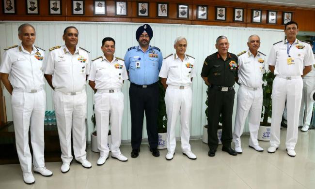 The Chief of Army Staff, General Bipin Rawat, the Chief of the Air Staff, Air Chief Marshal B.S. Dhanoa and the Chief of Naval Staff, Admiral Sunil Lanba at the Commanders’ Conference 2017, in New Delhi on October 25, 2017.