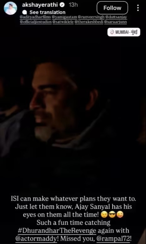 Exhibitor Akshaye Rathi captured Madhavan sitting among the audience and shared the picture on social media. He captioned the post: "ISI can make whatever plans they want to. Just let them know, Ajay Sanyal has his eyes on them all the time! Such a fun time catching..."