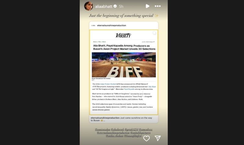 Mumbai/IBNS: Bollywood star Alia Bhatt and filmmaker Payal Kapadia-backed projects have been selected in the official lineup of films unveiled by the 2025 edition of Asian Project Market at the Busan International Film Festival (BIFF).