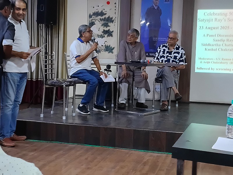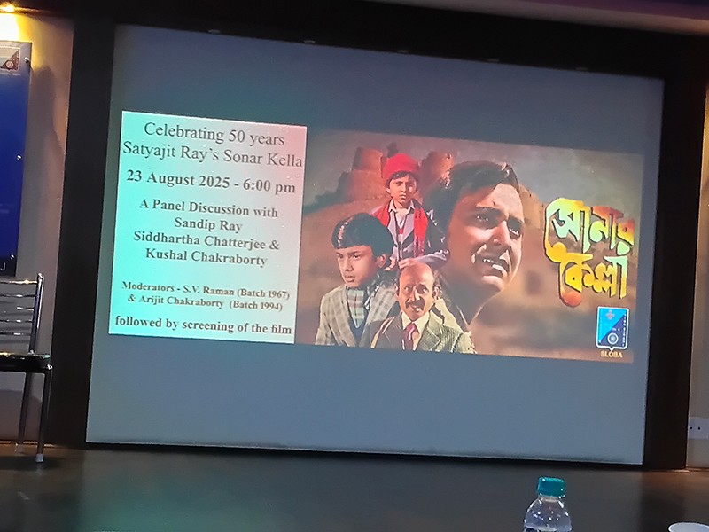 The occasion was a panel discussion at St. Lawrence School marking 50 years of Sonar Kella—which also coincided with the golden jubilee of the school’s Old Boys Association. Sandip Ray, along with Siddhartha Chatterjee (Topshe) and Kushal Chakraborty (Mukul), revisited memories of the iconic film, sharing anecdotes with a delighted audience.