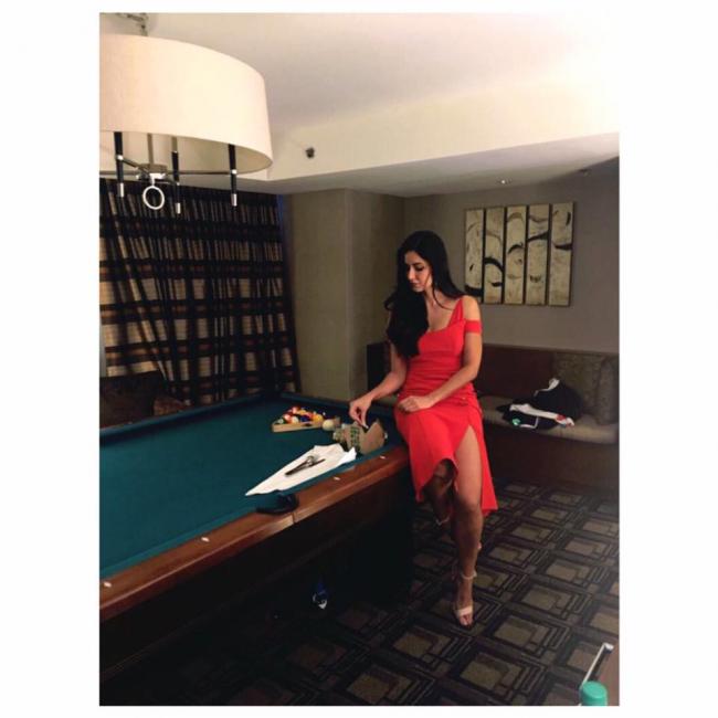 Wearing a red dress and sitting on a pool table, the Bollywood diva posted an image from her New York visit on Facebook for her fans.