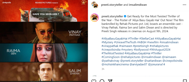 Sharing the poster on her Instagram handle, Preeti wrote, "Get Ready for the Most Twisted Thriller of the Year - The Poster of ‘Aliya Basu Gayab Hai’ Out Now!