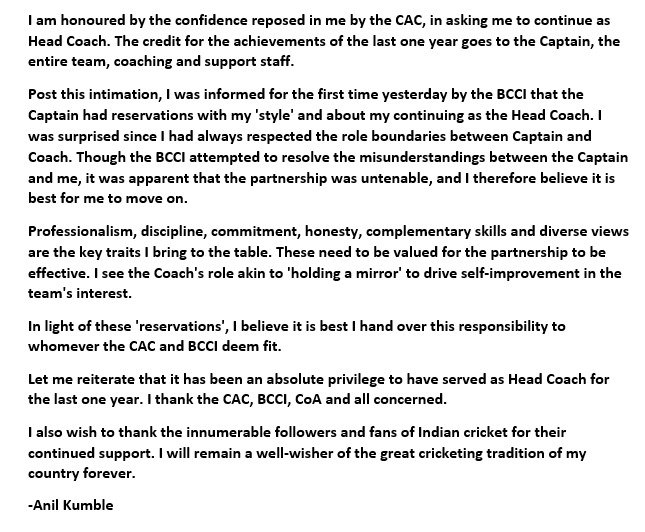 Issuing a statement on Twitter, Kumble said: "I was informed for the first time yesterday by the BCCI that the Captain had reservations with my 'style' and about my continuing as the Head Coach."