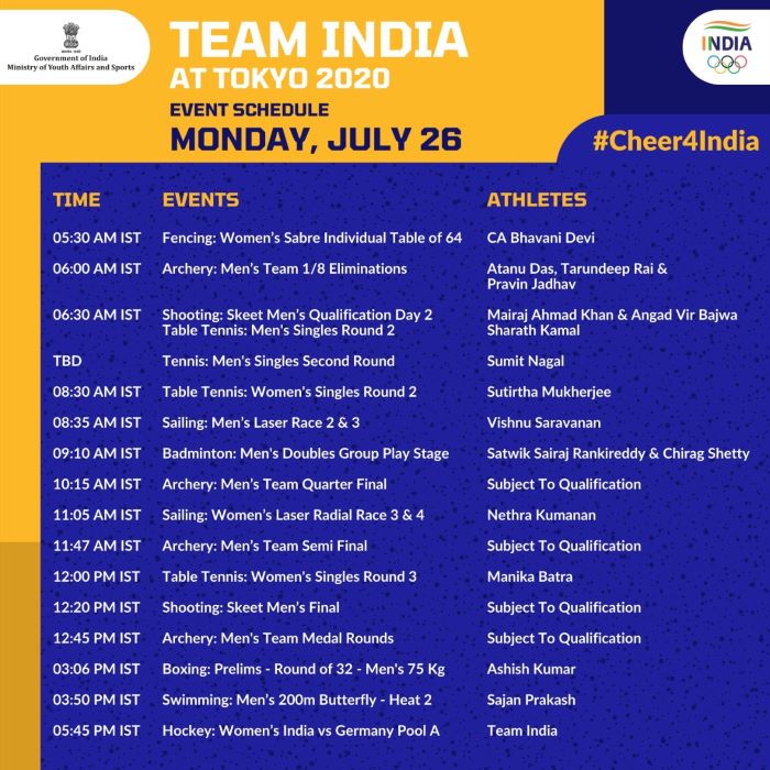Here is the schedule for the various events, Team India will be in action.