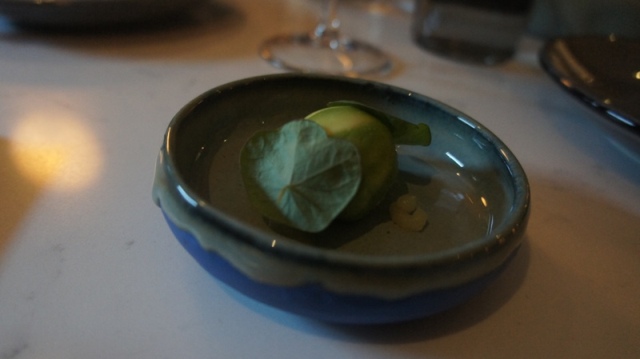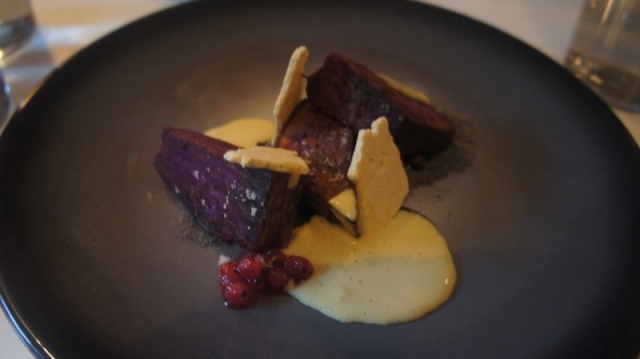 Well, I had  Capital Oysters, citrus mignonette; Pickled Mackerel, cauliflower, lemon, almond, brown butter;  Sweet Potato Baked in Ash, red currants, mustard meringue, brandy sabayon and from the Bar Snacks  Fried Chickpea Cake, lemon chili aioli.