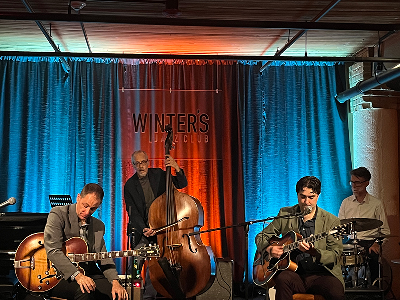 Andy Brown on guitar, Andy Pratt on vocal and guitar, Denis Luxion on piano, and Phil Gratteau on drums turned the small venue into some classy jazz hotspot. Photo by the author.