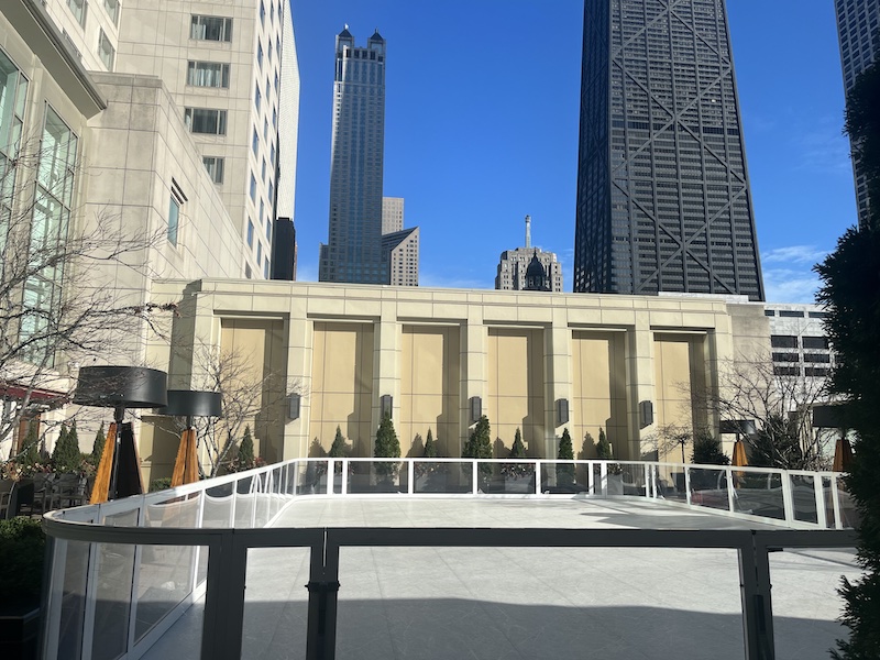 The Peninsula Sky Rink is a 2,100 sq ft (200 sq m) hybrid rink. This is the only hotel skating rink in Chicago and debuted in December 2012. Surrounded by Chicago’s skyscrapers and twinkling lights, the rink is tucked into a pine tree winter wonderland and bathed in festive music and snowflake lighting.