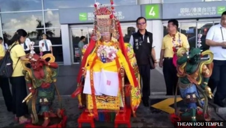 Three Chinese deity statues were seen travelling in a flight from Xiamen in China to the Malaysian capital Kuala Lumpur, the BBC reported.