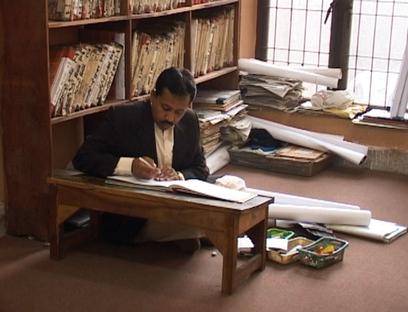 A patwari works on updating paper land records at the land records station in Lahore, Pakistan. Pakistan and India both are working to digitise land records to make them easier to access and reduce disputes and corruption. (Shiraz Hasnat)