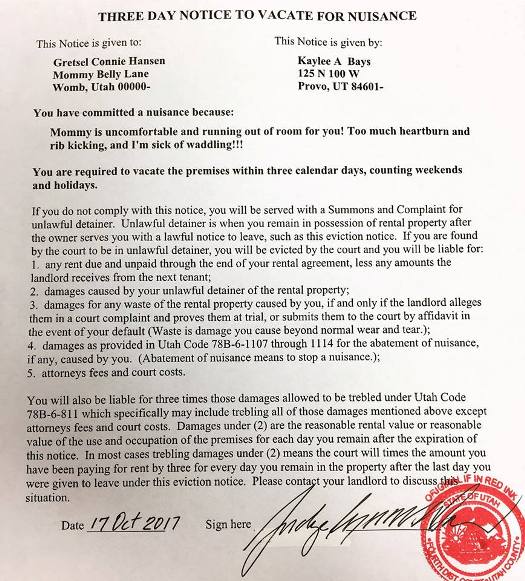 Provo, Oct 25 (IBNS): In a hilarious incident, a mom to be served a legal notice to her fetus for being a nuisance, 12 hours before she gave birth to her daughter.