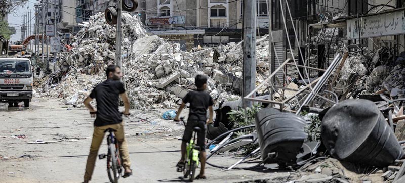 A tower block lies in ruins in Gaza city following an Israeli air strike.Photo Courtesy: UNRWA/Mohamed Hinnawi