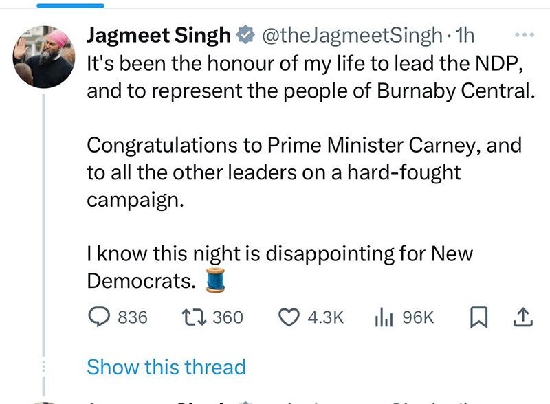 "I know this night is disappointing for New Democrats. But we are only defeated when we believe those that tell us we can never dream of a better Canada," Singh, whose defeat is a blow to the Khalistan supporters in Canada, posted on X.