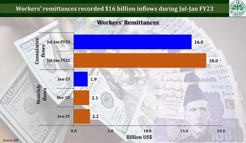 With a cumulative inflow of 16 billion dollars during the first seven months of the ongoing 2022-2023 fiscal year (from July 2022 to January 2023), the remittances decreased by 11 percent as compared to the same period last year, the figures showed.