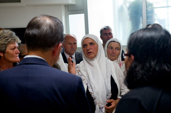 On a visit in July 2012 to the memorial site for the victims of the 1995 massacre in Srebrenica, Secretary-General Ban Ki-moon (back to camera) meets with victims’ families. UN Photo/Eskinder Debebe (file)