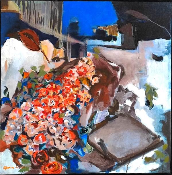 Aparna's imagery does capture this dichotomy but more through a poetic lens rather than a journalistic approach; for instance, the roses bleed their colour onto a grey backdrop.