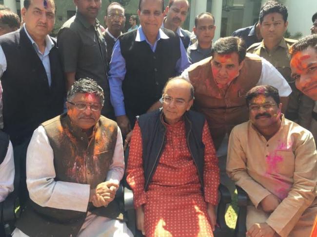 Basking in the glory of their recent success in the Assembly elections, the BJP leaders too celebrated Holi at their homes. Finance Minister Arun Jaitley tweeted pictures of the celebration at his home on Monday.