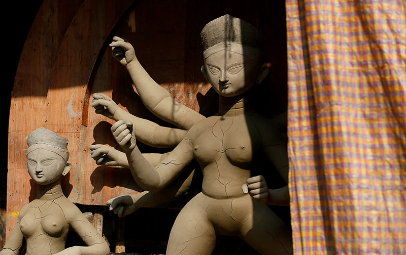 In the warrens of Kolkata's clay artists' colony Kumartuli, the idols of goddess Durga with ten splayed arms and three observant eyes, are getting final touches in the second year of a global pandemic. IBNS writer Debayani Bose marvels at the defiance of the potters to disease and universal budget crunch as they mold the lumps of clay into paragons of divinity