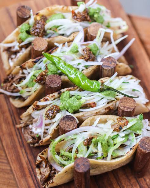The first to arrive was tacos made from our very own phulka filled with lal maas, and served with mirch achar, ker sangri sabji and coriander chutney.