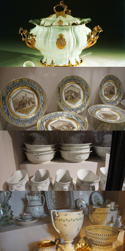 This white and gold dinner service was acquired for EmperorFerdinand in 1851. Ferdinand, abdicated from the throne during the course of thebourgeois revolution of 1848 and subsequently moved to Prague,where he lived until his death.The white and gold dinner service was ordered for his household in Prague from the porcelain manufactory of the Countsof Thun at Klösterle in Bohemia.