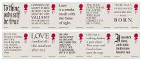 Available on Tuesday, the ten First Class stamps pay tribute to the genius of Shakespeare through his immortal words and poetry.
