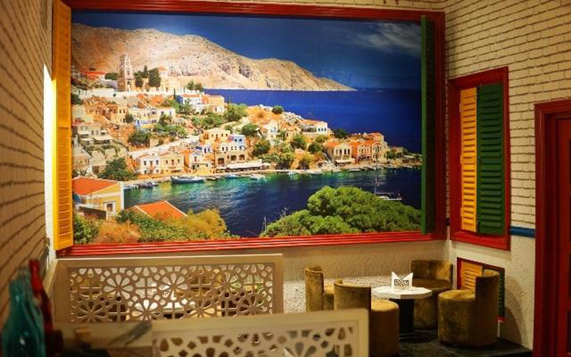 Symi stands out amidst a staid neighbourhood with its vermilion coloured tiled-roof, red and white awning and bright coloured windows opening out onto the street. The colourful exterior resembles one of Symi’s crayon-coloured houses. Its elegant interiors painted in pastels, sports a photographic representation of panoramic view of Symi spread across an entire wall, while colourful furniture pieces add vibrancy.