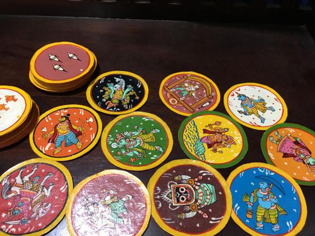 For example, the rules of playing the Dashavatara cards of Bishnupur in West Bengal are perhaps lost forever. The deck of 120 circular cards contain pictures of the 10 incarnations of Vishnu in the first and second set of 10 cards each (the difference being the incarnations are housed in a temple in the first set while the temple is missing in the second set) and the remaining are marked by dots for numbers.