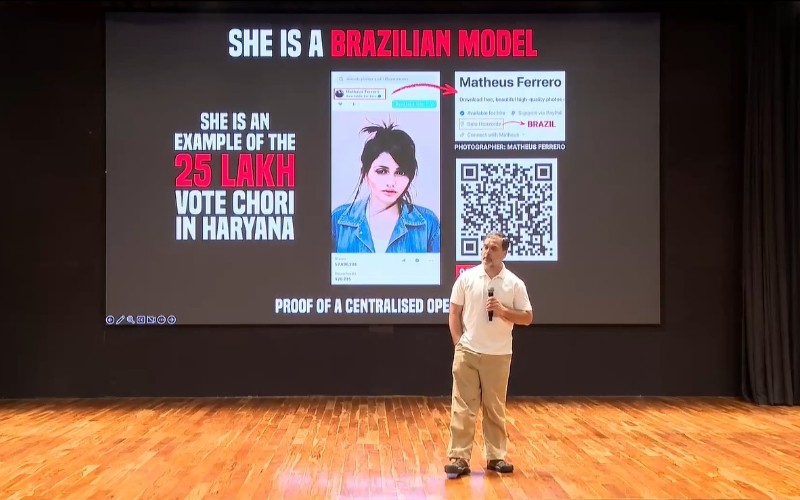 He also displayed another woman’s image that appeared 223 times in two polling booth lists, accusing the Election Commission of destroying booth CCTV footage to hide evidence.