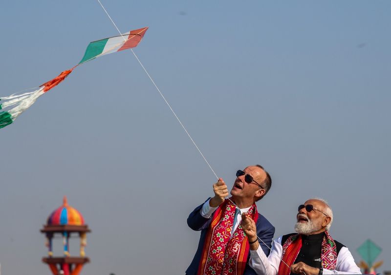The Sabarmati Riverfront in Ahmedabad witnessed a rare moment of political bonhomie on Monday as Prime Minister Narendra Modi was seen flying kites alongside visiting German Chancellor Friedrich Merz.