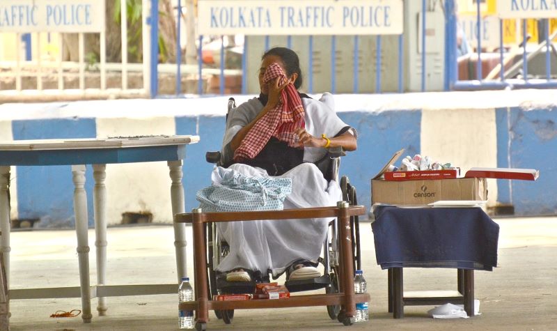 Mamata, who started her dharna a few minutes before 12 noon, sat for hours on her wheelchair near Gandhi statue all alone with no poster or banner but wrapping a black shawl round her neck.