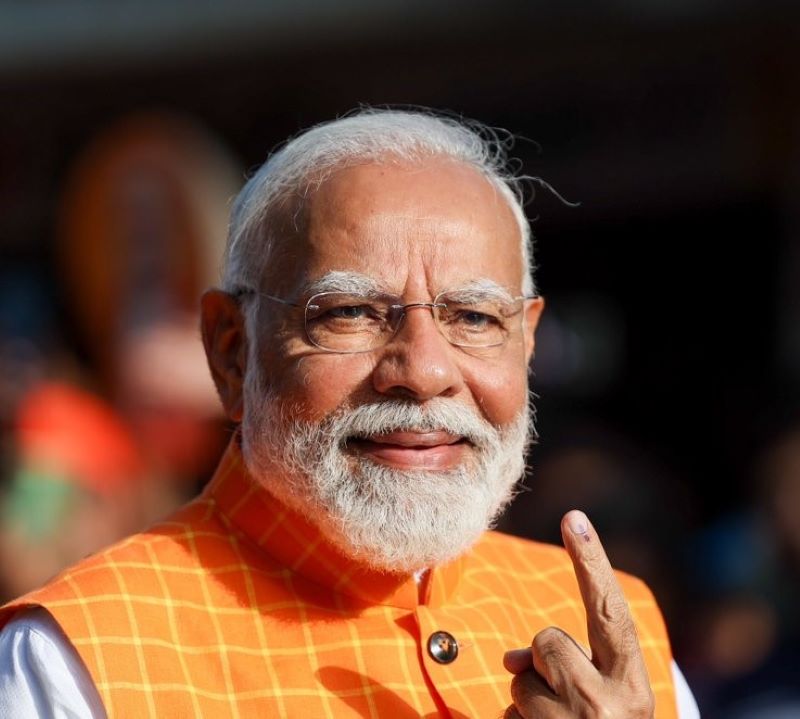 Modi raised his inked finger to the crowd waiting to cast their votes.