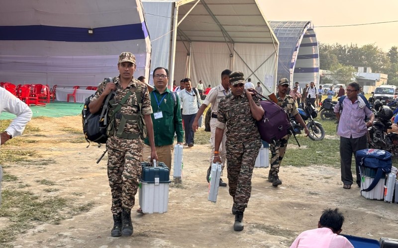 Security personnel and polling officers are being deployed to polling stations from a distribution centre in Saharsa district, Bihar, ahead of Phase 1 of the Bihar elections, November 5, 2025. Photo: Facebook/@ECI