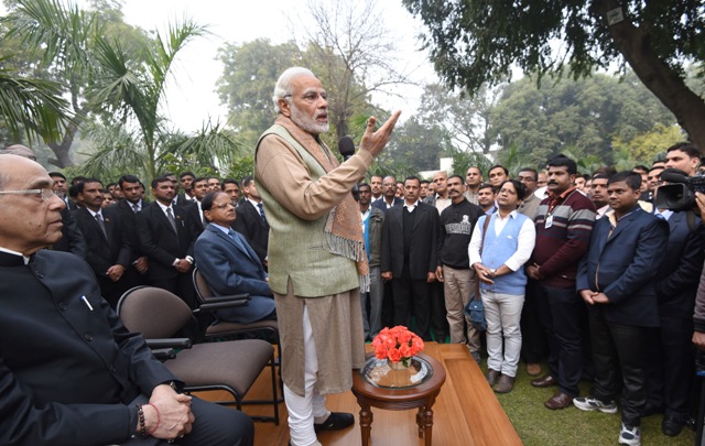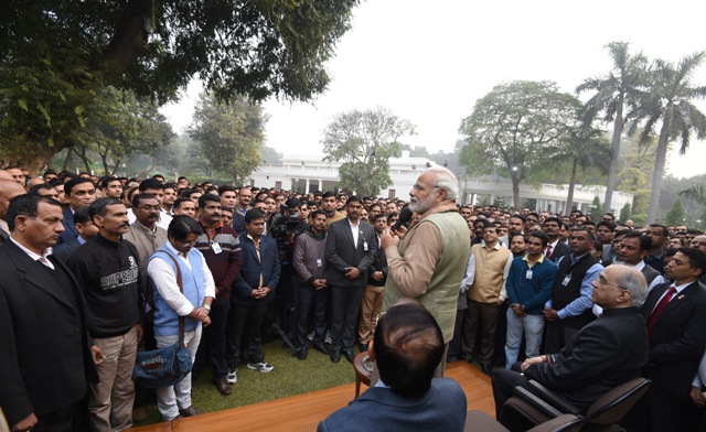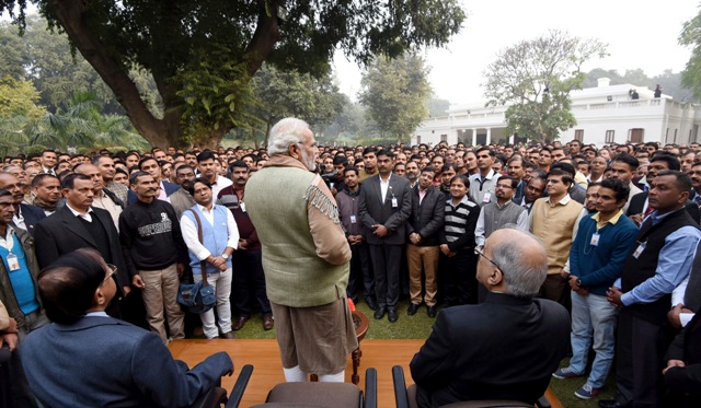 The Prime Minister, Narendra Modi met and exchanged new year greetings with the PMO officials and SPG personnel, at Lok Kalyan Marg, in New Delhi on January 02, 2018.