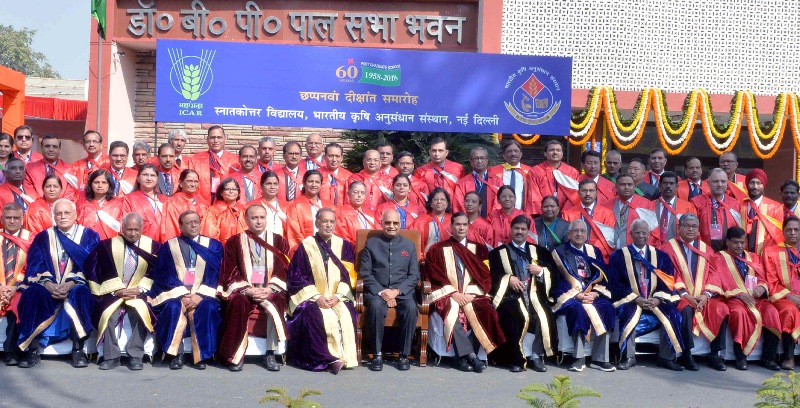 The President, Ram Nath Kovind in a group photograph, at the 56th Convocation of the Post Graduate School of the Indian Agriculture Research Institute, in New Delhi on February 09, 2018. The Union Minister for Agriculture and Farmers Welfare, Radha Mohan Singh, the DG, ICAR, Dr. T. Mohapatra and other dignitaries are also seen.