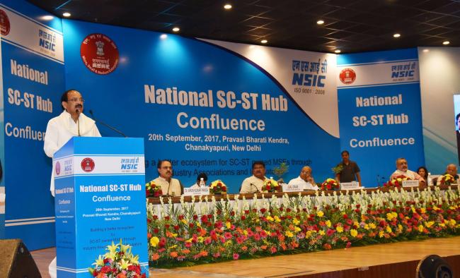 The Vice President,M.VenkaiahNaidu addressing the National SC-ST Hub Confluence, organised by the Ministry of Micro, Small & Medium Enterprises, in New Delhi on September 20, 2017. The Union Minister for Social Justice and Empowerment,Thaawar Chand Gehlot, the Union Minister for Tribal Affairs,Jual Oram, the Minister of State for Micro, Small & Medium Enterprises (I/C)Giriraj Singh and the Minister of State for Finance,ShivPratap Shukla are also seen.