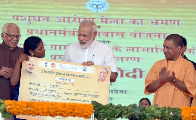 The Prime Minister,Narendra Modi distributing the certificate to beneficiaries of the Pradhan Mantri Awas Yojana (Rural & Urban), at Shahanshahpur, Varanasi, Uttar Pradesh on September 23,2017.The Governor of Uttar Pradesh,Ram Naik and the Chief Minister, Uttar Pradesh, Yogi Adityanath are also seen.