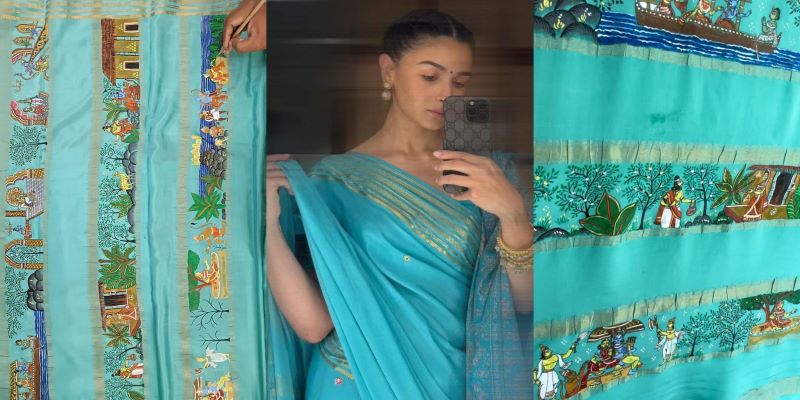 In a long Instagram post, celebrity fashion stylist Ami Patel revealed that the turquoise blue Mysore silk saree, which had the miniature paintings in a traditional Pattachitra, took 100 hours to get completed.