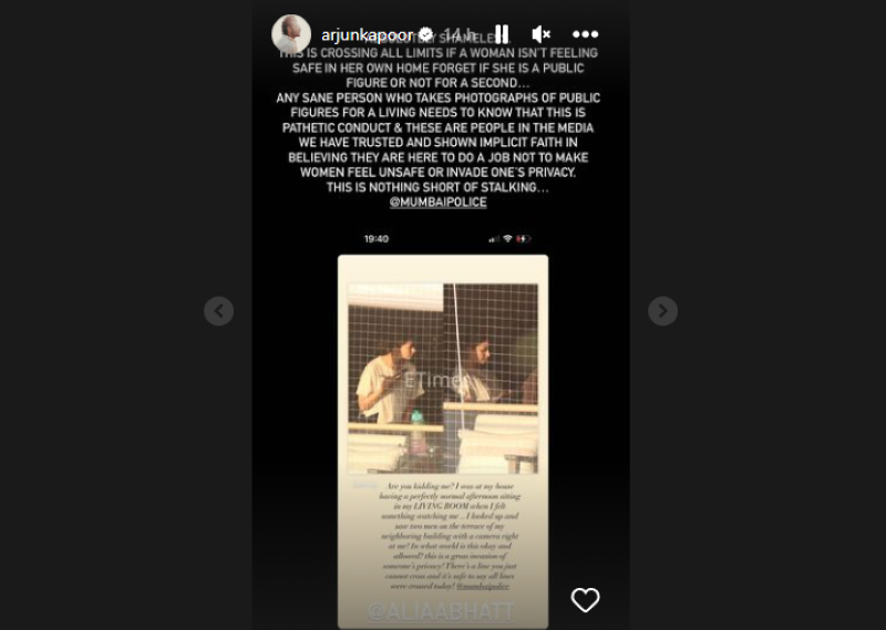 Supporting Alia, actor Arjun Kapoor wrote on Instagram, "Absolutely shameless. This is crossing all limits if a woman isn't feeling safe in her own home, forget if she is a public figure or not for a second...