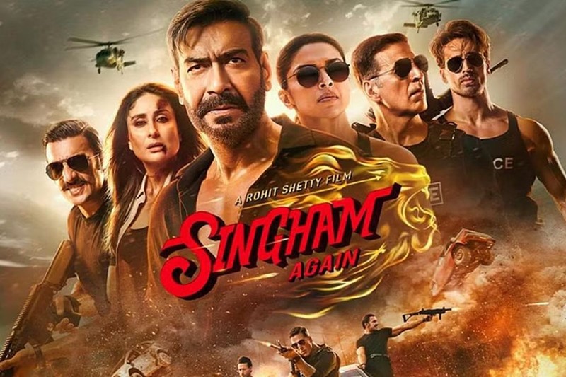 A poster of Singham Again starring Ajay Devgn, Kareena, Deepika, Tiger Shroff and Akshay Kumar