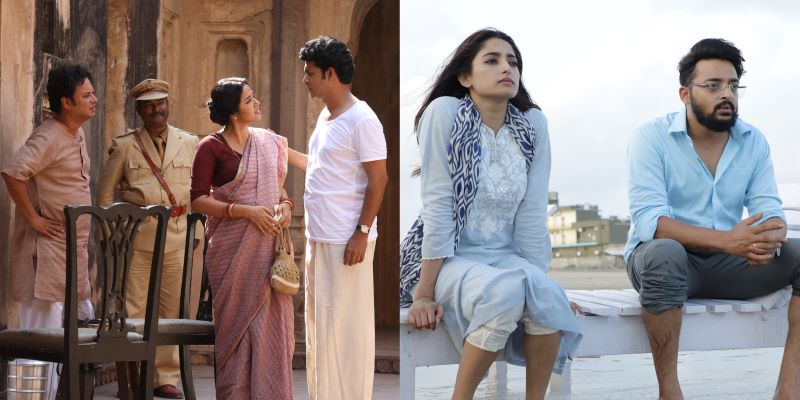 (From L to R) Rahul Banerjee, Sohini Sarkar and Anirban Bhattacharya in 'Durgo Rawhoshyo', Ishaa Saha and Saurav Das in 'Antormahal'