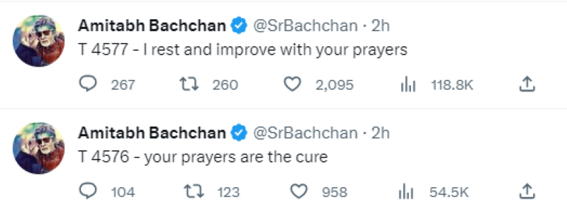 Bachchan on Tuesday gave his health update tweeting, "I rest and improve with your prayers. Your prayers are the cure."