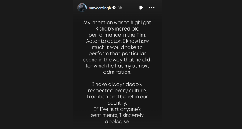 In an Instagram story, Ranveer clarified that his act was meant as praise for Rishab’s performance in Kantara: Chapter 1.