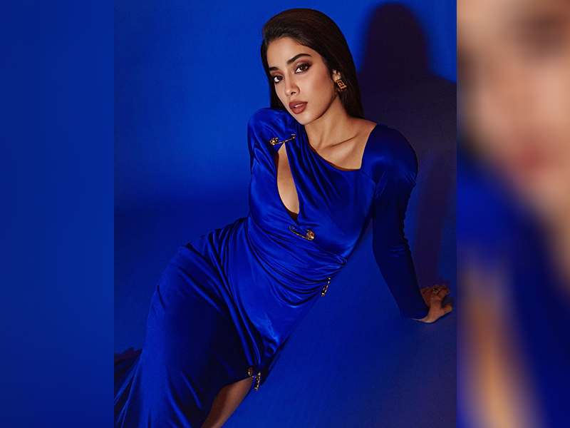 In the pictures, Janhvi styled herself in a blue thigh-high slit dress.