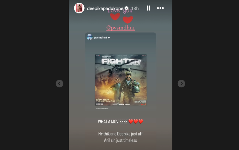 Sindhu shared an Instagram story where she wrote, "What a Movieeee. Hrithik and Deepika just uff. Anil sir, just timeless."