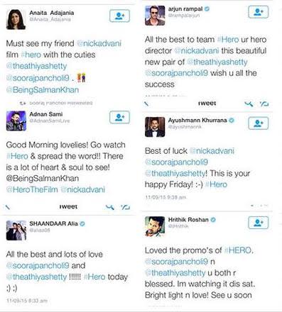 The great kick start to the film has brought in a lot appreciation for both Sooraj and Athiya and the newcomers are touted to be the next big thing. Friends and well-wishers from the industry showered their love on these two as well. Here’s what they wrote on Twitter: