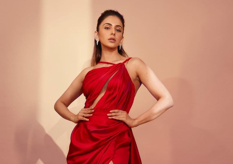 In the pictures, Rakul is seen wearing a red cutout dress.