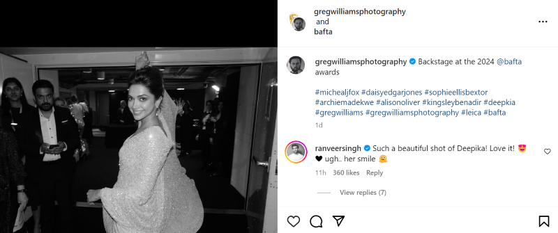 Ranveer Singh loves Deepika Padukone's backstage picture from BAFTA 2024. See post