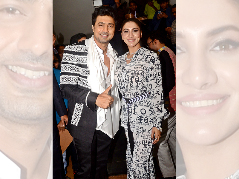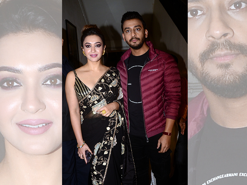 Dev-Rukmini pose during premiere at Priya Cinema, Kolkata. (Image Credit: Avishek Mitra/IBNS)